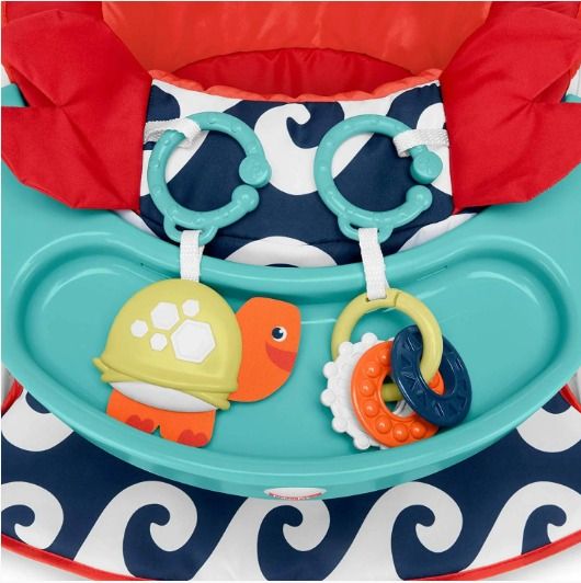 Com assento macio e uma base resistente oferece um local confortável para o bebê sentar, interagindo com 2 brinquedinhos a sua frente, da própria cadeira e com o mundo ao seu redor.